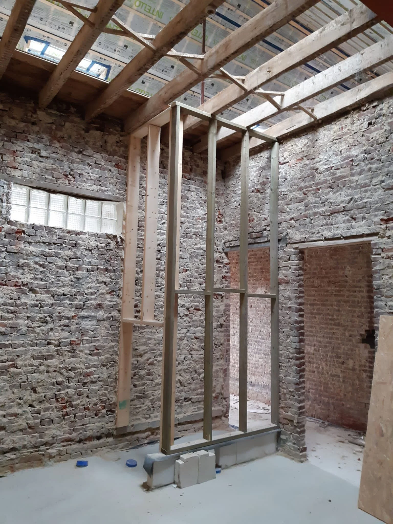 Uitgevoerde werken: riolering, fundering, daktimmer en bedekking, gevelisolatie en afwerking, binnenwanden en plafonds, buitenschrijnwerk in hout, technieken, vloer en tegelwerken